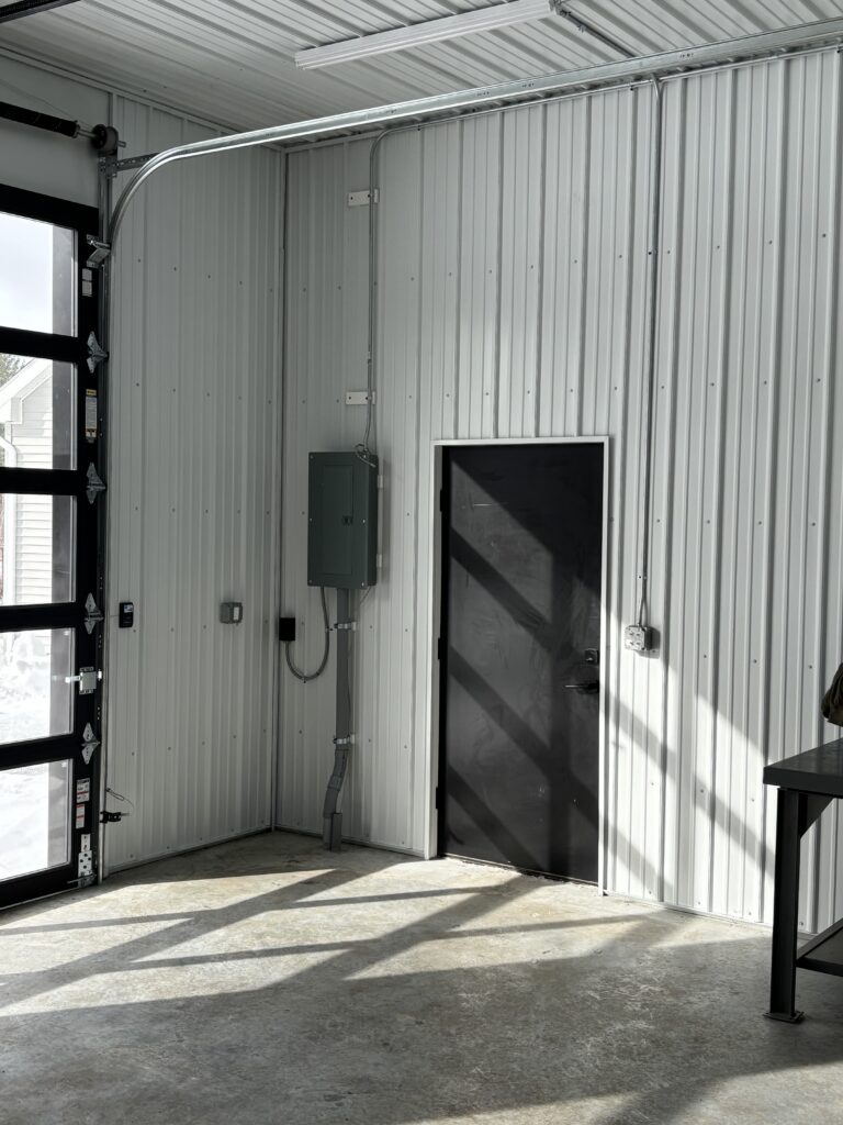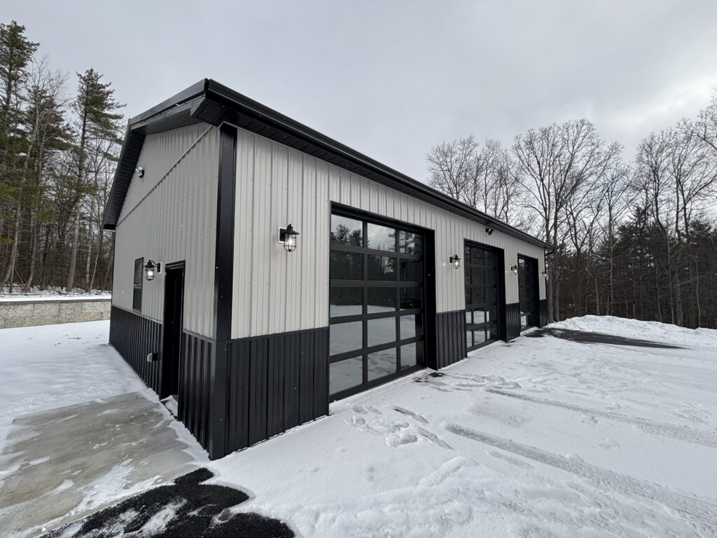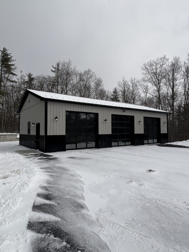This New York post-frame build proves that great design doesn’t take a season off. Even surrounded by snow, this 30′ x 50′ garage stands out with its ash gray siding, black roofing and wainscoting, and the three all-glass garage doors take this build to another level!