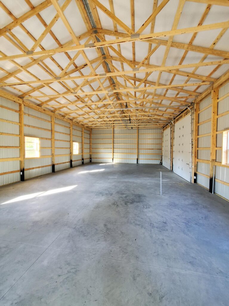 This 30′ x 60′ garage is a perfect example of the kind post-frame buildings we build year after year. With two large overhead doors, a simple entry door, seven windows, a sharp wainscot look, and a finished concrete floor, this building is set up to be put to use day one.