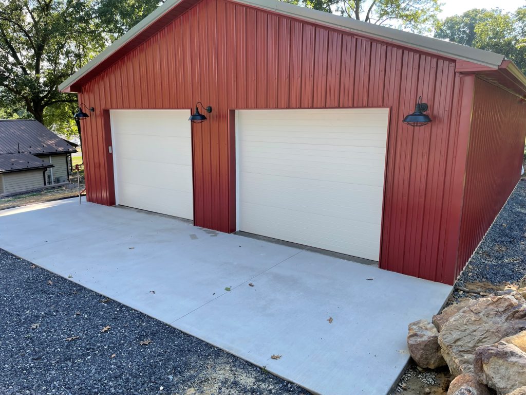 Here’s an absolutely stunning workshop for an awesome customer near Lewiston, PA. The footprint is a standard sized 30′ wide by 40′ long. The ceiling height is 9′ 6″ which easily accommodates the 10′ wide and 8′ high garage doors. (Garage doors require anywhere from 12″ to 18″ of headroom above the door opening to allow for the torsion spring assembly and overhead door tracks.) If you’re looking for a great contemporary color combination, look no further than this one! The RED siding is further complemented by the RED trim on the building walls. We even went so far as to provide RED soffit, fascia and gutters! A task not too great for the pro’s at Fetterville Pole Buildings. With the solid colored base all being the same color, when we dropped the White doors and windows onto the palette – the whole thing simply popped! Who says customers and builders can’t be artistic? 😉