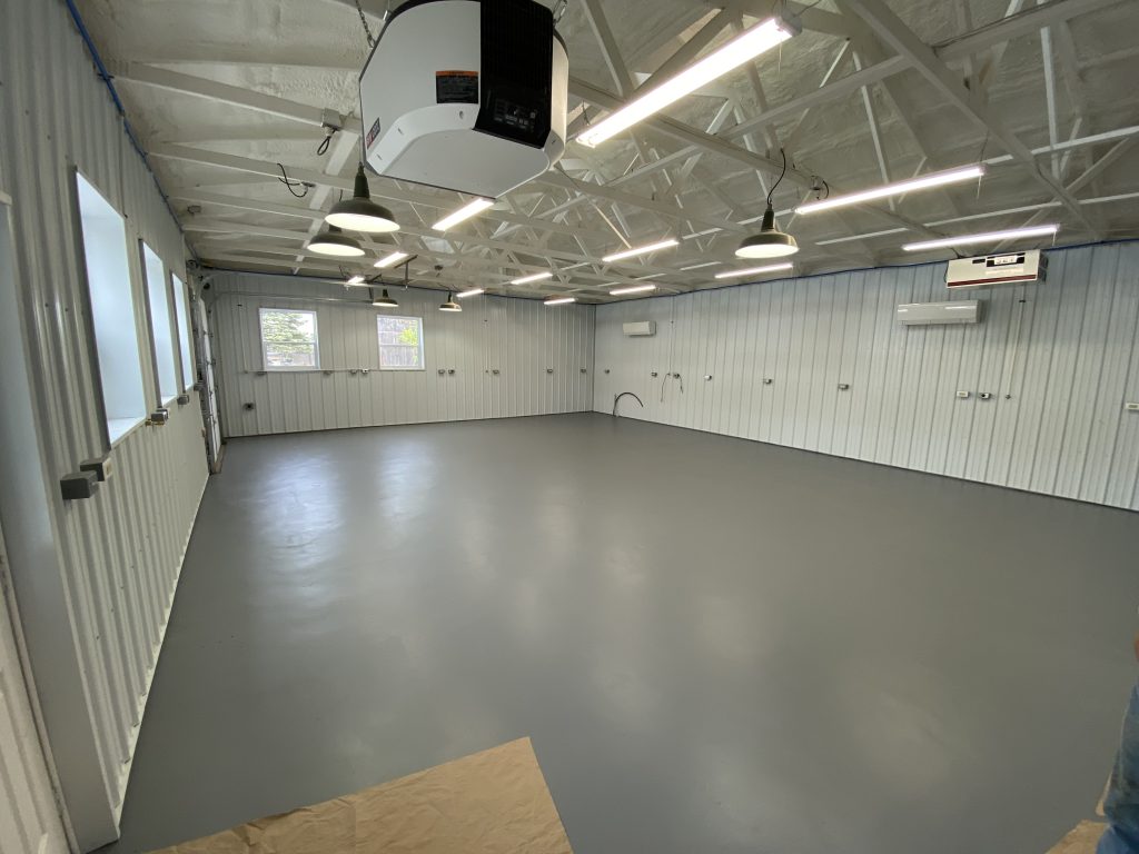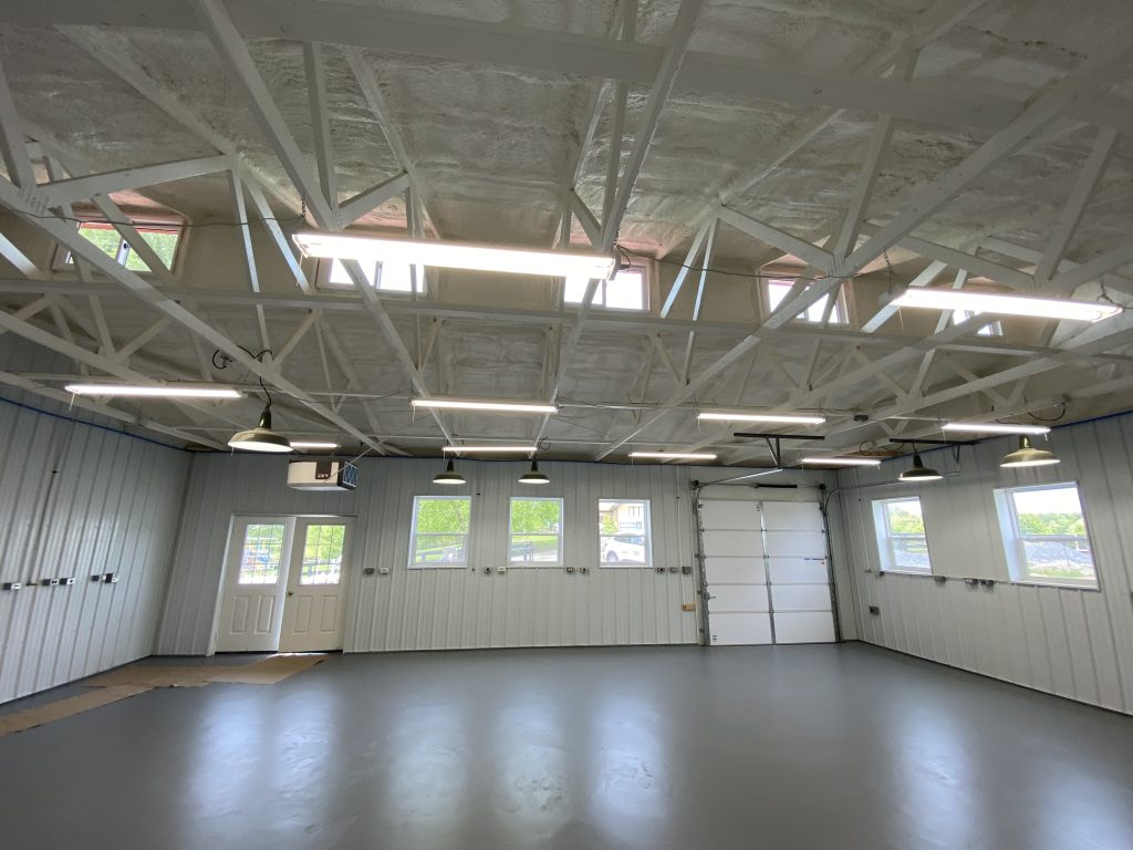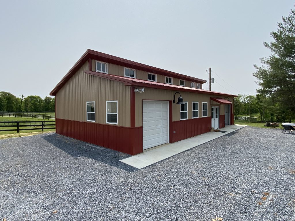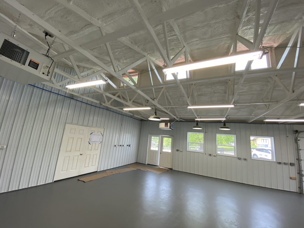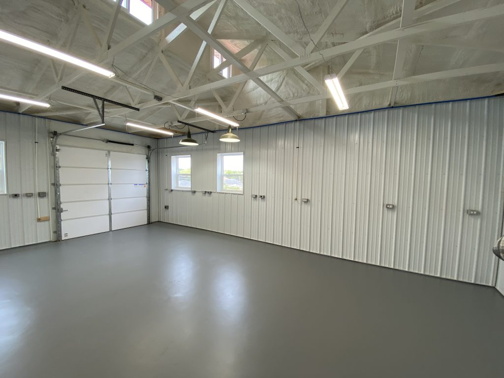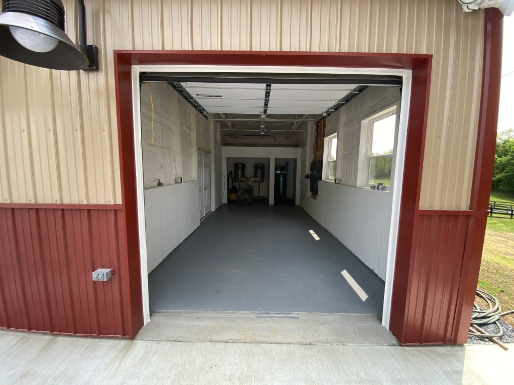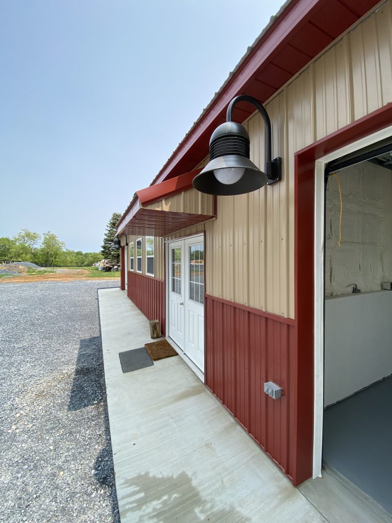 But back to the star of the show. This is what’s called a Clear Story design. The pitch of the roof in the rear is a 4/12, while the pitch in the front is a 3/12. The vertical elevated area at the peak is usually around 3′ high to allow for smaller windows to be placed. They in turn light up the interior with natural light and give the exterior appearance a real wow factor. Leaf through the pics and you’ll see that we constructed an extra interior wall with a 6′ double door to this separated area. The 6′ double door in the front is protected with an 8′ wide eyebrow roof. Very cool 😉