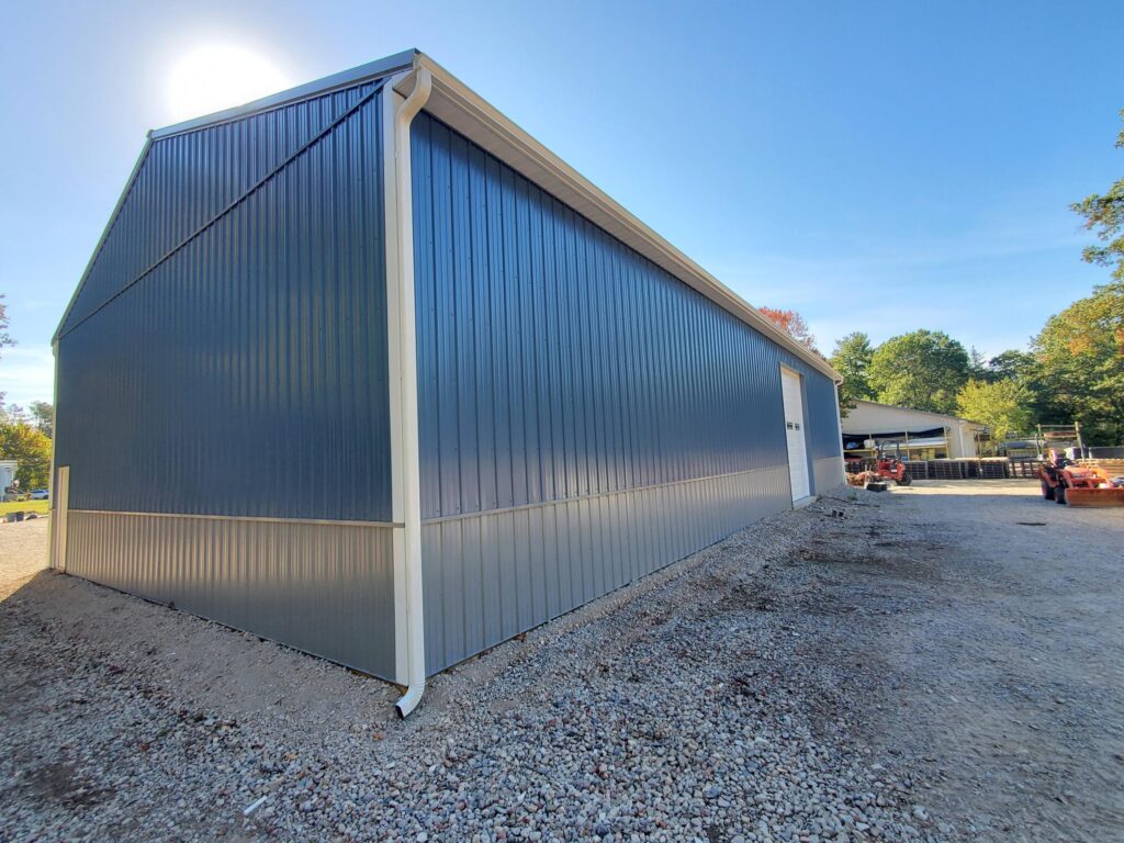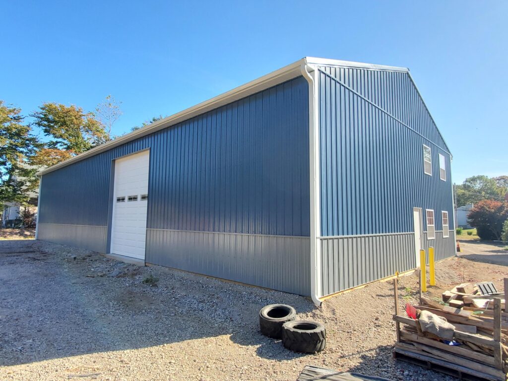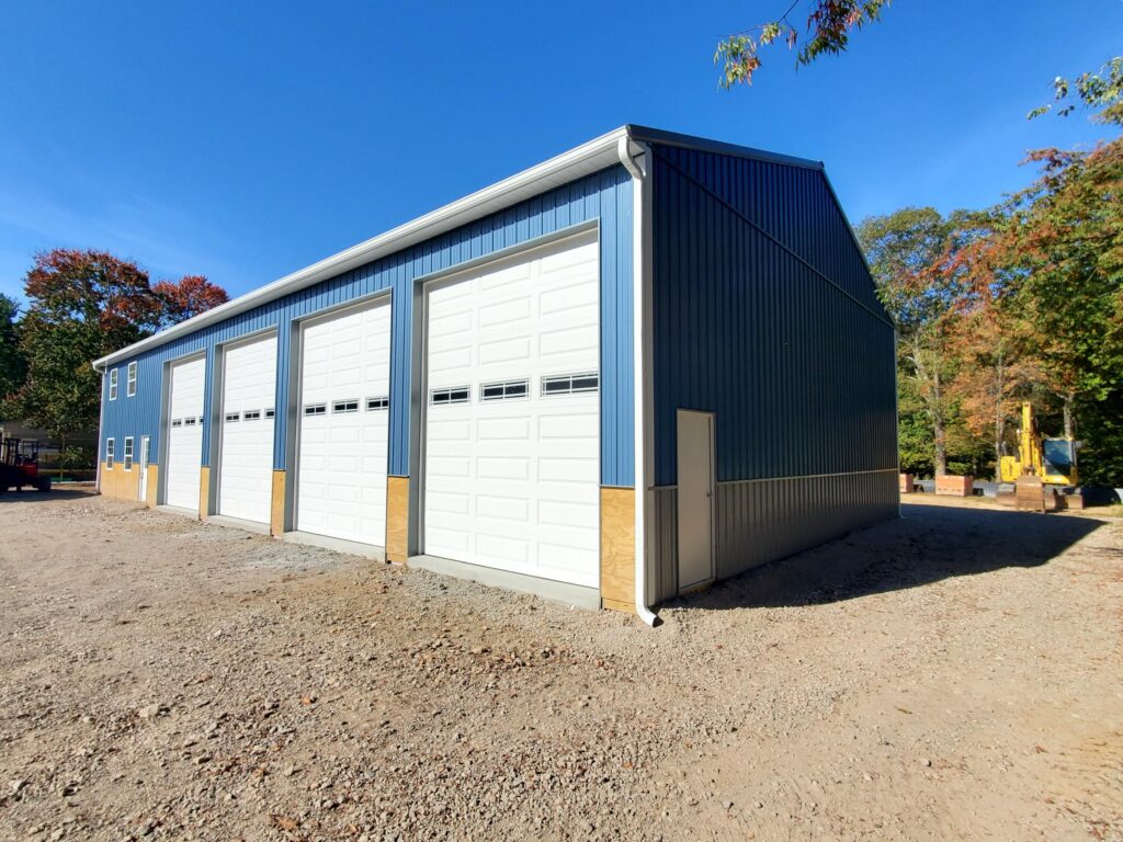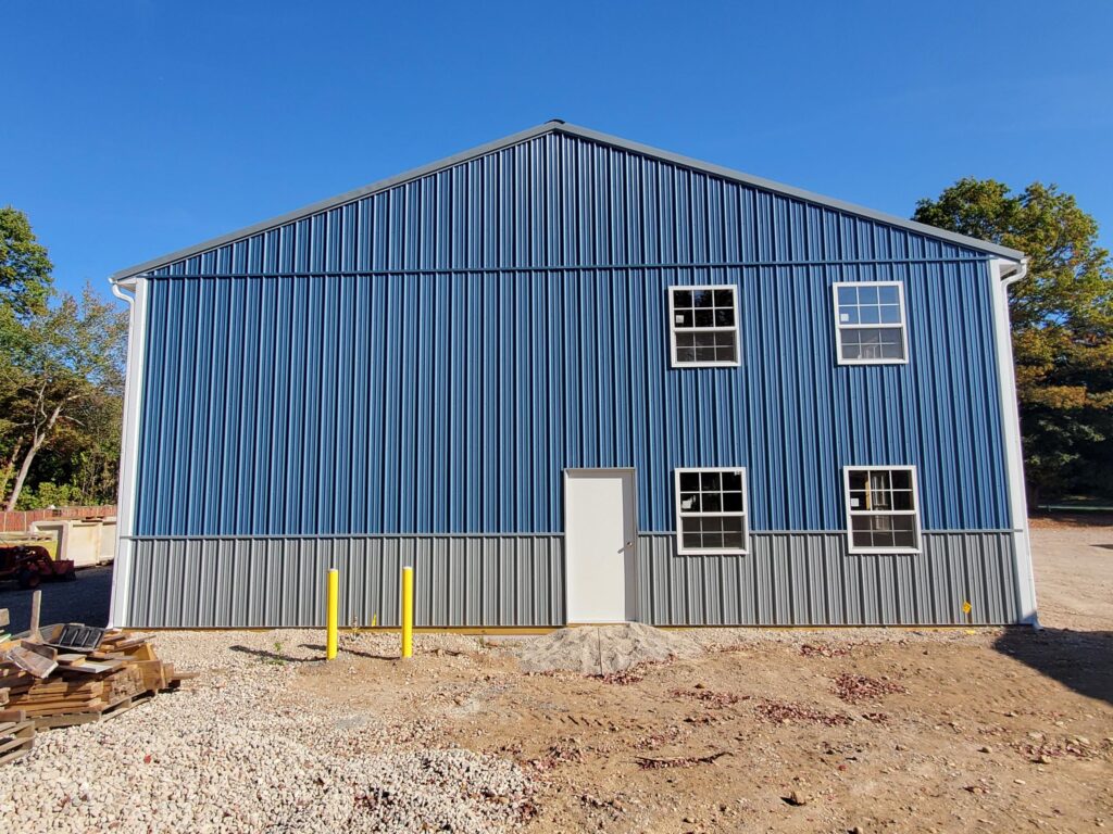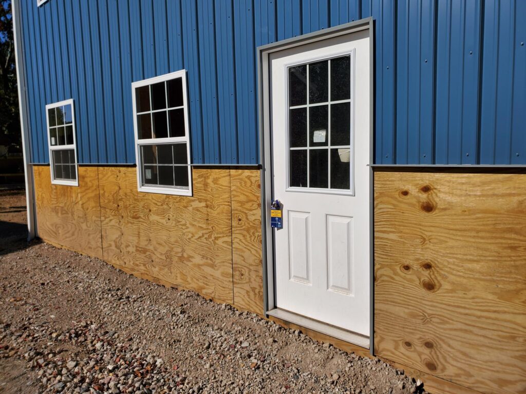 The Ocean Blue siding, Slate wainscoting, and Brite White trim give the building a crisp look. To take it a step further, we installed 4′ treated plywood on the front eave for the customer to add stone veneer — a custom touch that will make this build a true showpiece. From layout to finish, this building blends commercial function and looks good to!
