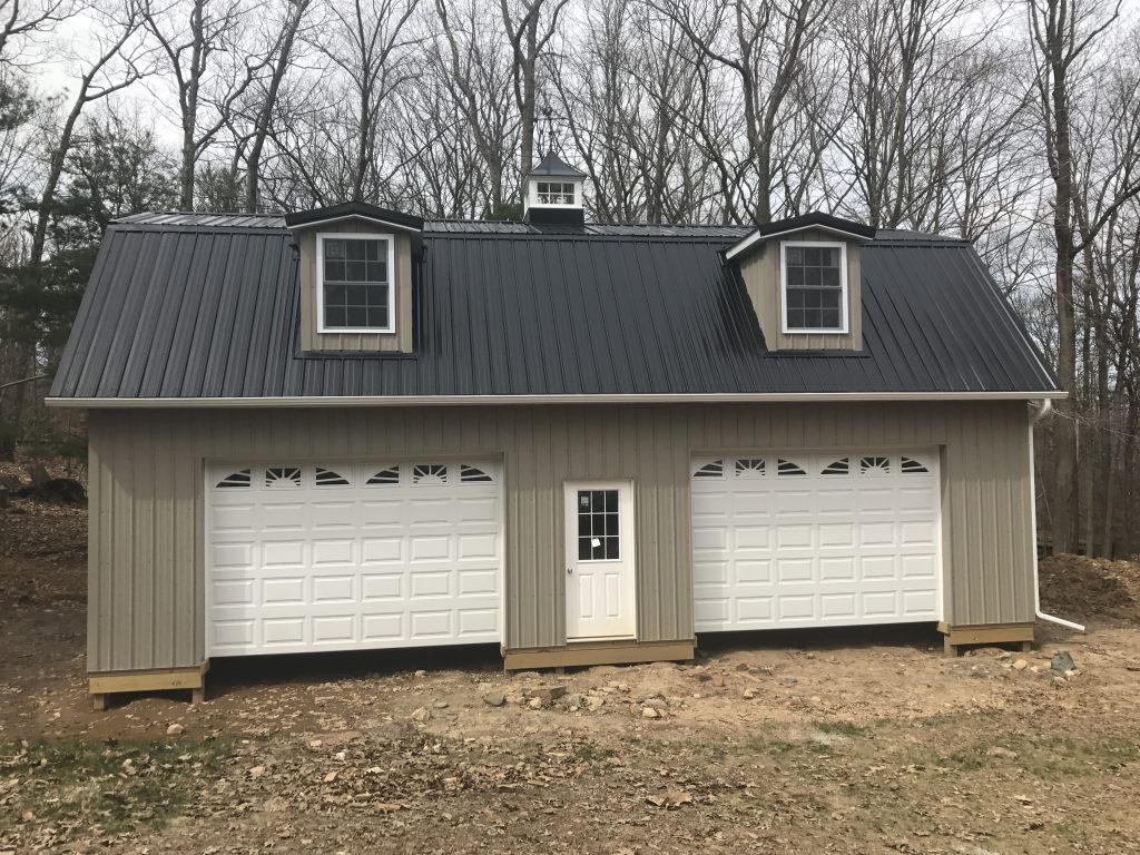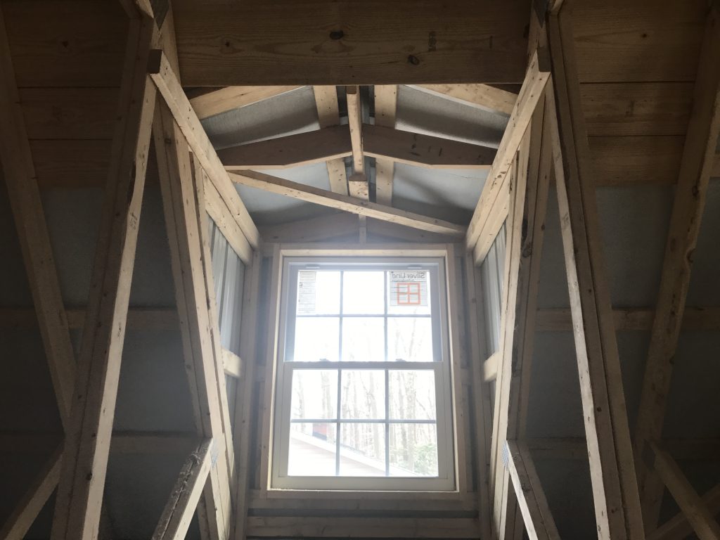 Here’s an awesome Gambrel Attic style building. Gambrel attics are sometimes preferred over common attic truss designs because of the interior room dimensions. In a gambrel attic you’ll typically get a square room shape whereas with an attic truss, typically the corners of the roof are mitered to meet the roof line. Gambrel attics typically cost a little more due to the increased metal and trim needed. (Essentially it’s 4 roof lines.) But skim through the pics and you’ll see what I mean. This one has a couple of simple 4′ wide dormers, each with a window, that really pull light into an otherwise dark attic room. Plus you get the added benefit of being able to walk out to the dormer windows, increasing the feel of the size of the space.