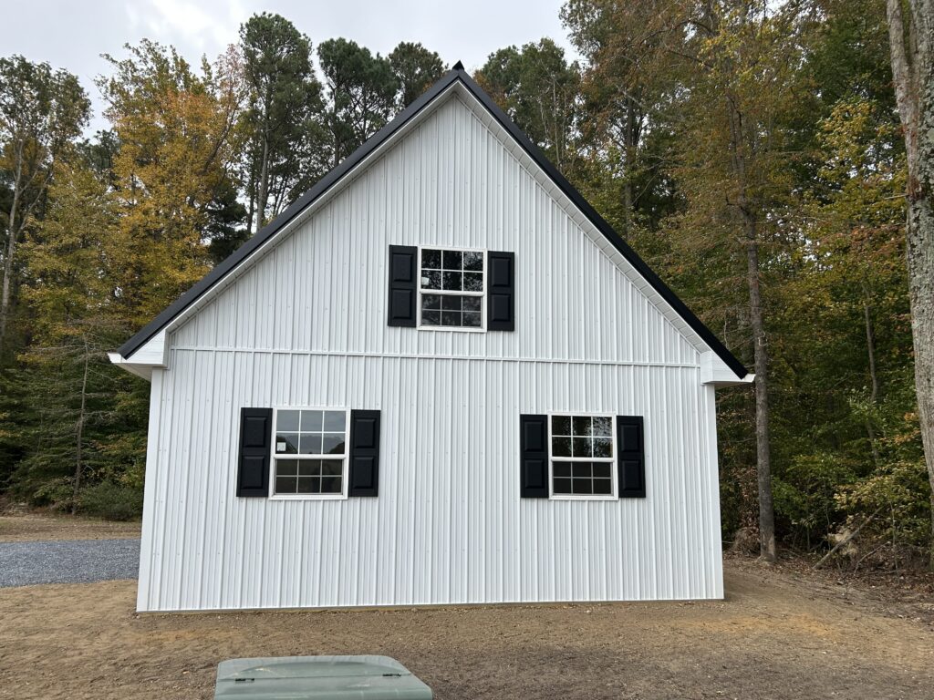 This clean and crisp 24′ x 40′ garage really pops — from the bold black 12/12 roof pitch to the perfectly paired white siding, black shutters, and gallery style garage doors. The steep roof adds instant character, while the front face of the building delivers a welcoming entrance with two garage doors and a 9-lite entry door.