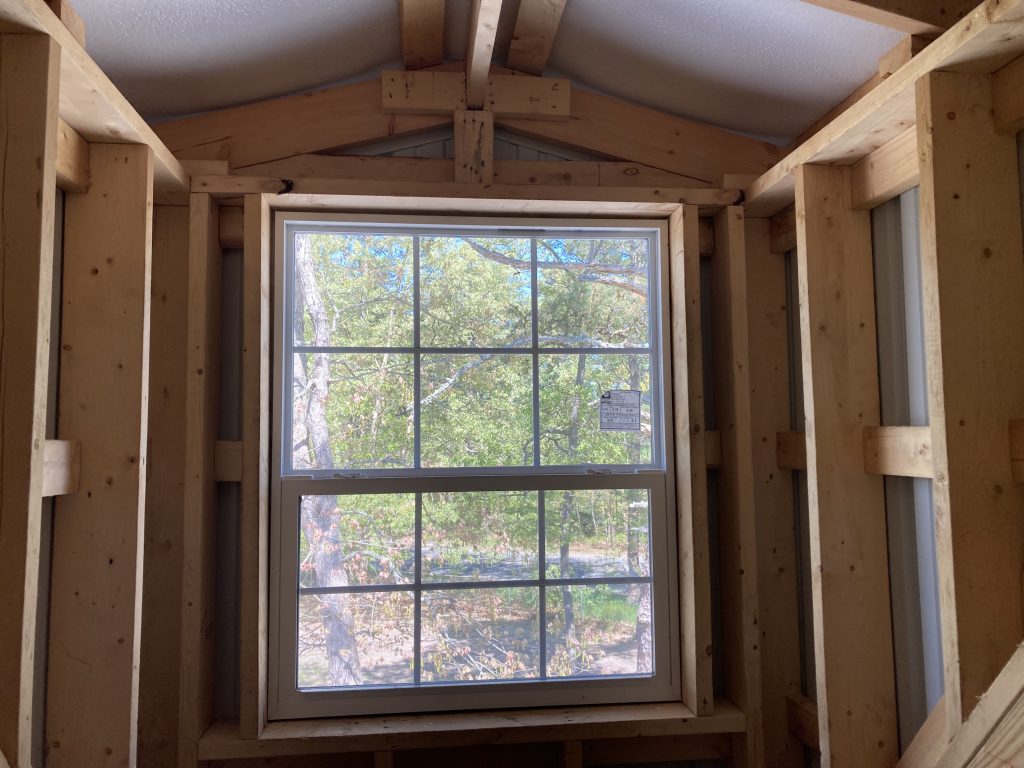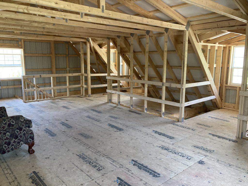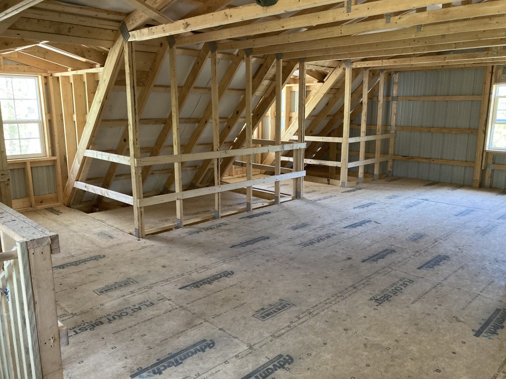 Here’s an amazing looking Gambrel Attic style building! This one’s loaded. The gambrel roof shape provides for a big, cozy, comfy upstairs room area with countless possibilities on how to finish and use the space. The oversized 6′ wide dormers allow light to pour into the space as well as providing access to literally walk over and look out of the window onto the property below. We always put down a 3/4″ Tongue and Groove (T&G) sub floor in our attic rooms to provide a strong and sturdy base. We also install 2×4 nailers along the attic room walls to meet local building codes.